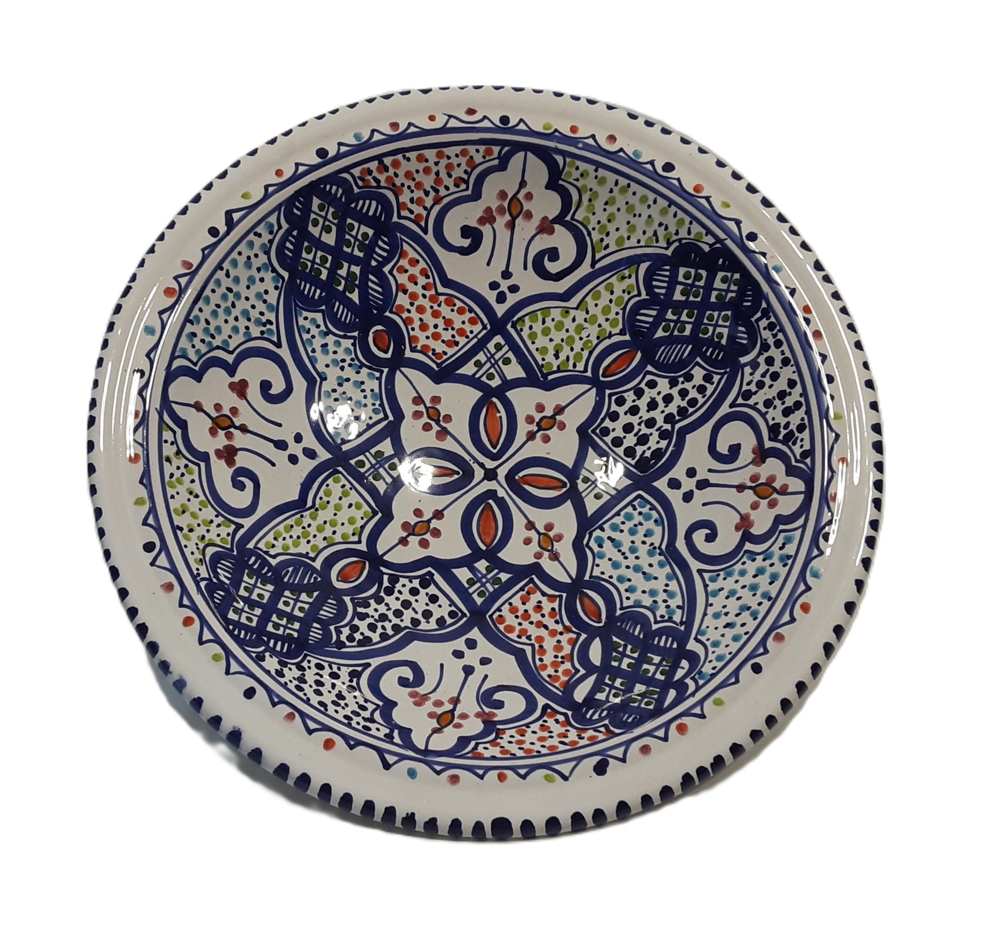 Bring a touch of Mediterranean charm to your home with this handmade and hand-painted ceramic bowl from Tunisia. Made from high-quality ceramic and coated with a smooth, food-safe glaze, this bowl is designed to last. Hand-painted patterns unique to Tunisian heritage, each plate is a one-of-a-kind piece showcasing artisan craftsmanship. Easy to care for, it’s best hand washed to preserve the delicate painting.