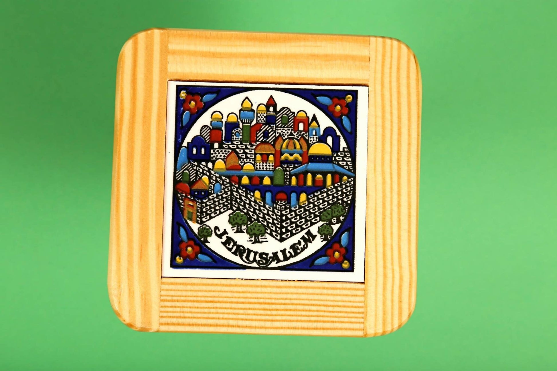 Olive wood , Ceramic Coaster- Jerusalem Deisgn. Made in Palestine