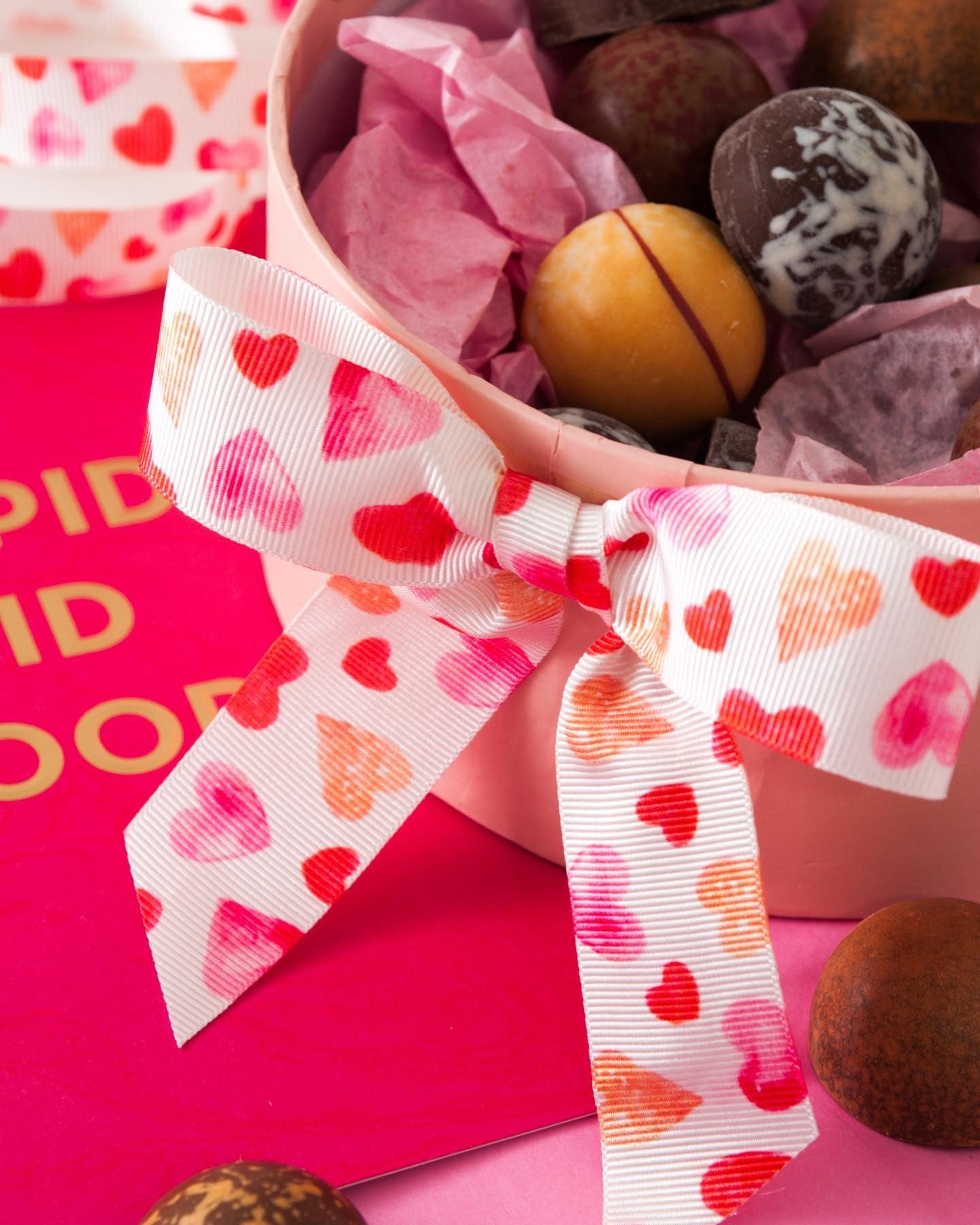 Pretty painted hearts dance along this gorgeous ribbon, perfect for creating hair accessories and finishing touches to valentine. Made from Polyester. Machine wash at 40 degrees. Do not bleach. Use a cool iron. Do not tumble dry.